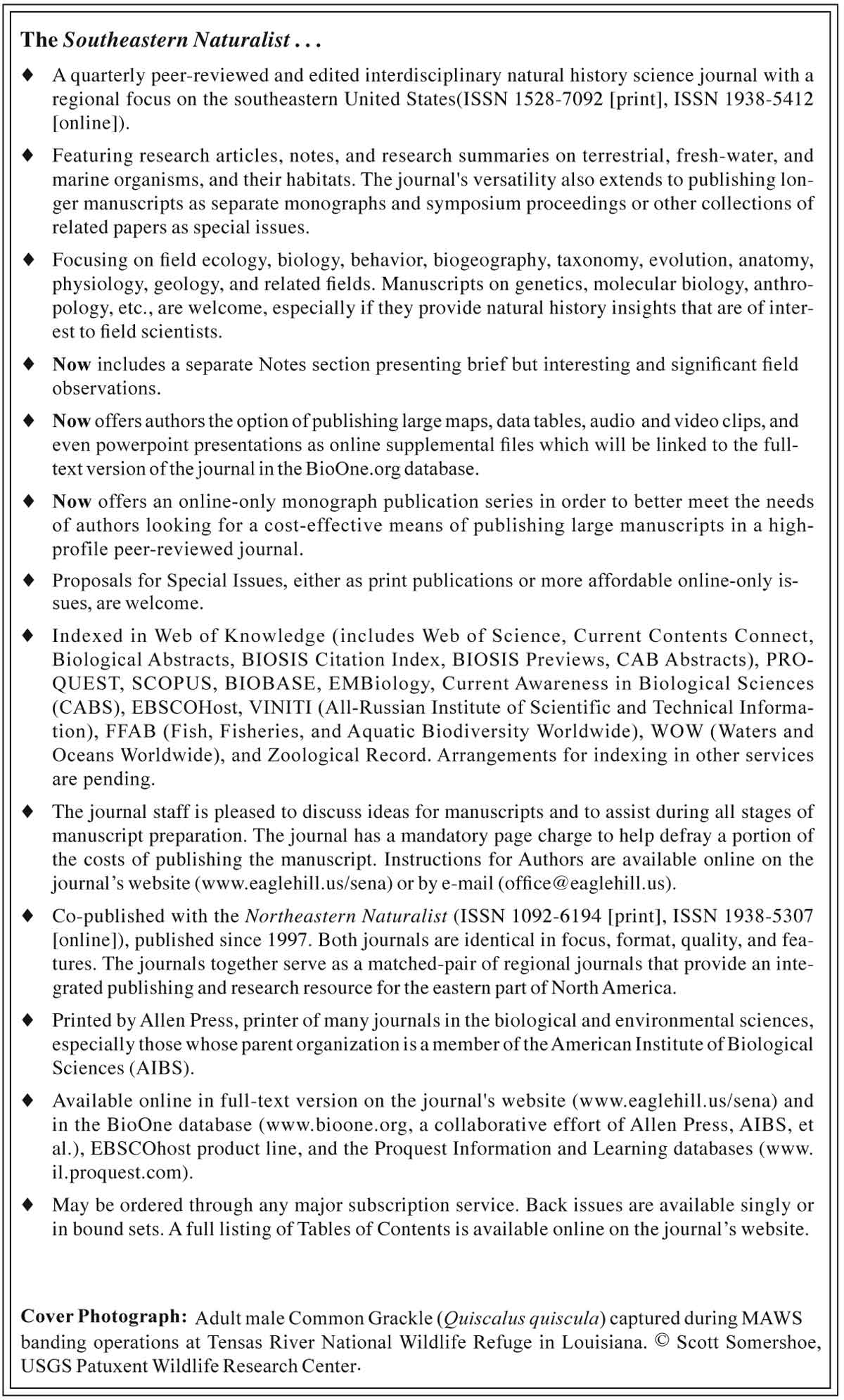 The Southeastern Naturalist is a peer-reviewed journal that covers all aspects of natural history within the southeastern United States. We welcome research articles, summary review papers, and observational notes.