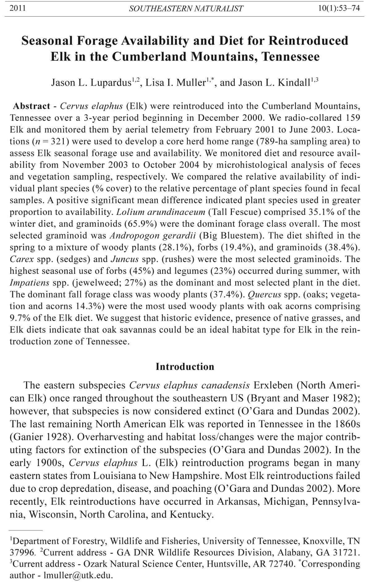 Abstract - Cervus elaphus (Elk) were reintroduced into the Cumberland Mountains,