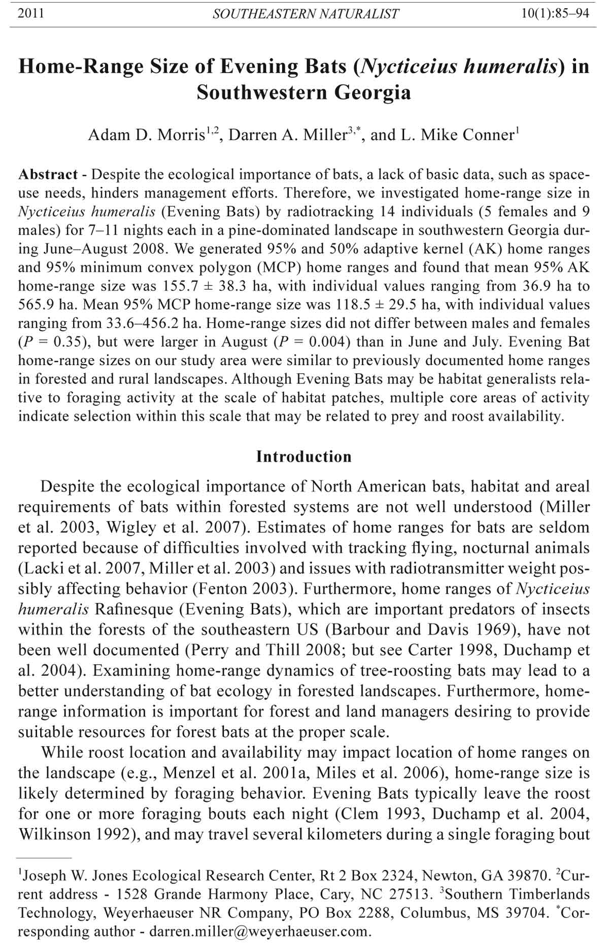 Home-Range Size of Evening Bats (Nycticeius humeralis) in