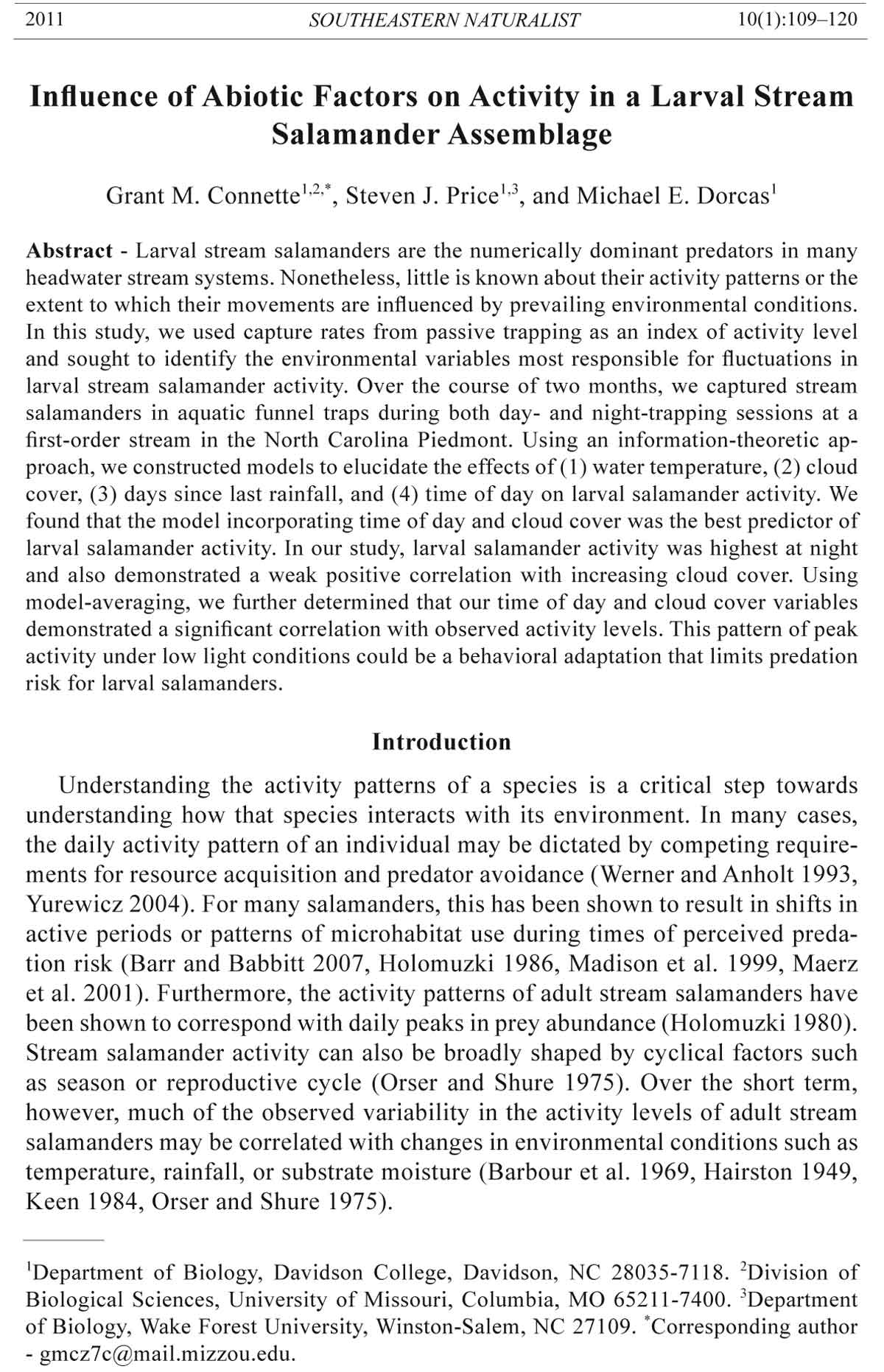 abiotic factors on the observed activity patterns of larval stream salamanders.