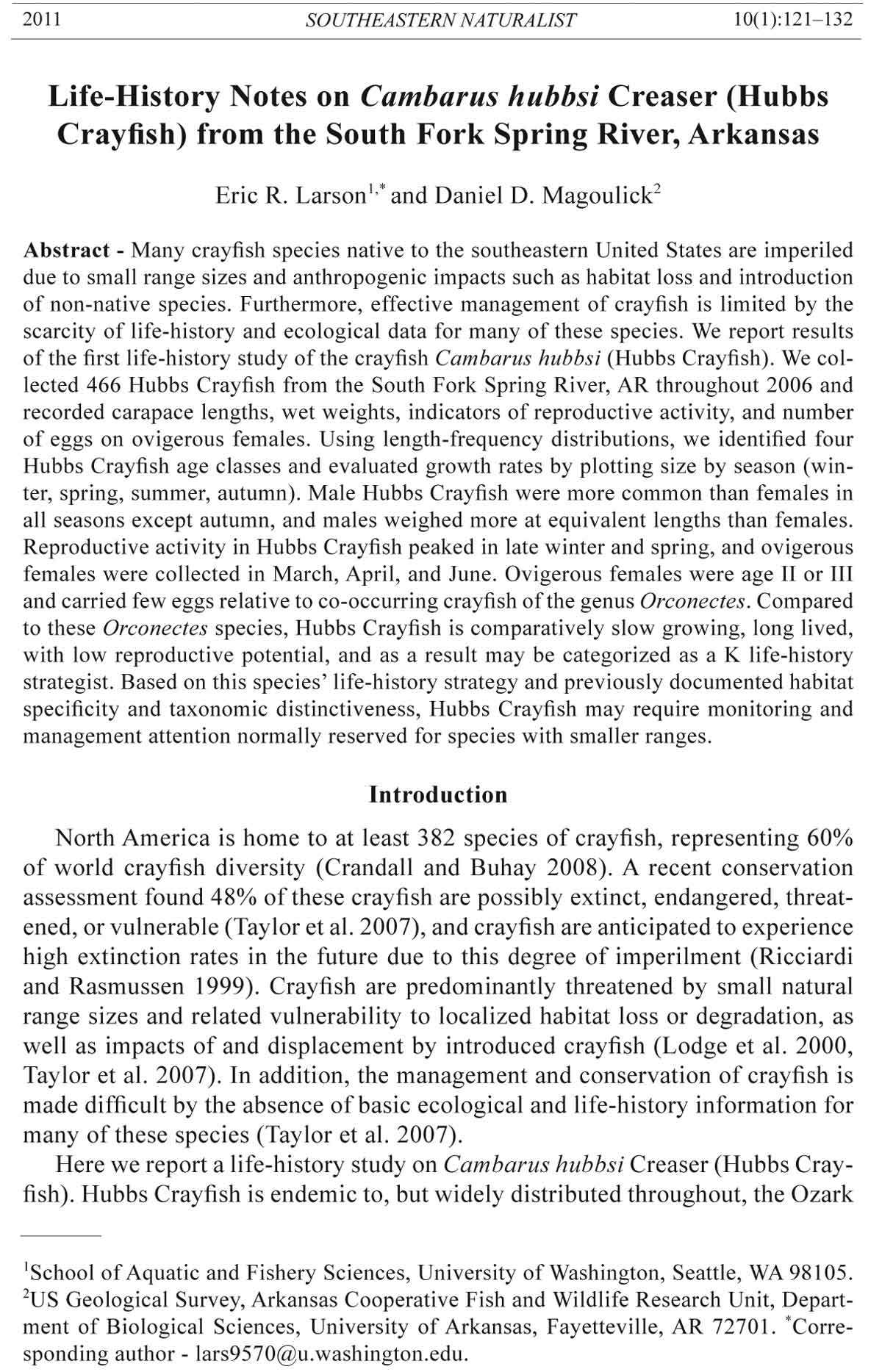 Larson, E.R., and D.D. Magoulick. 2008. Comparative life history of native (Orconectes