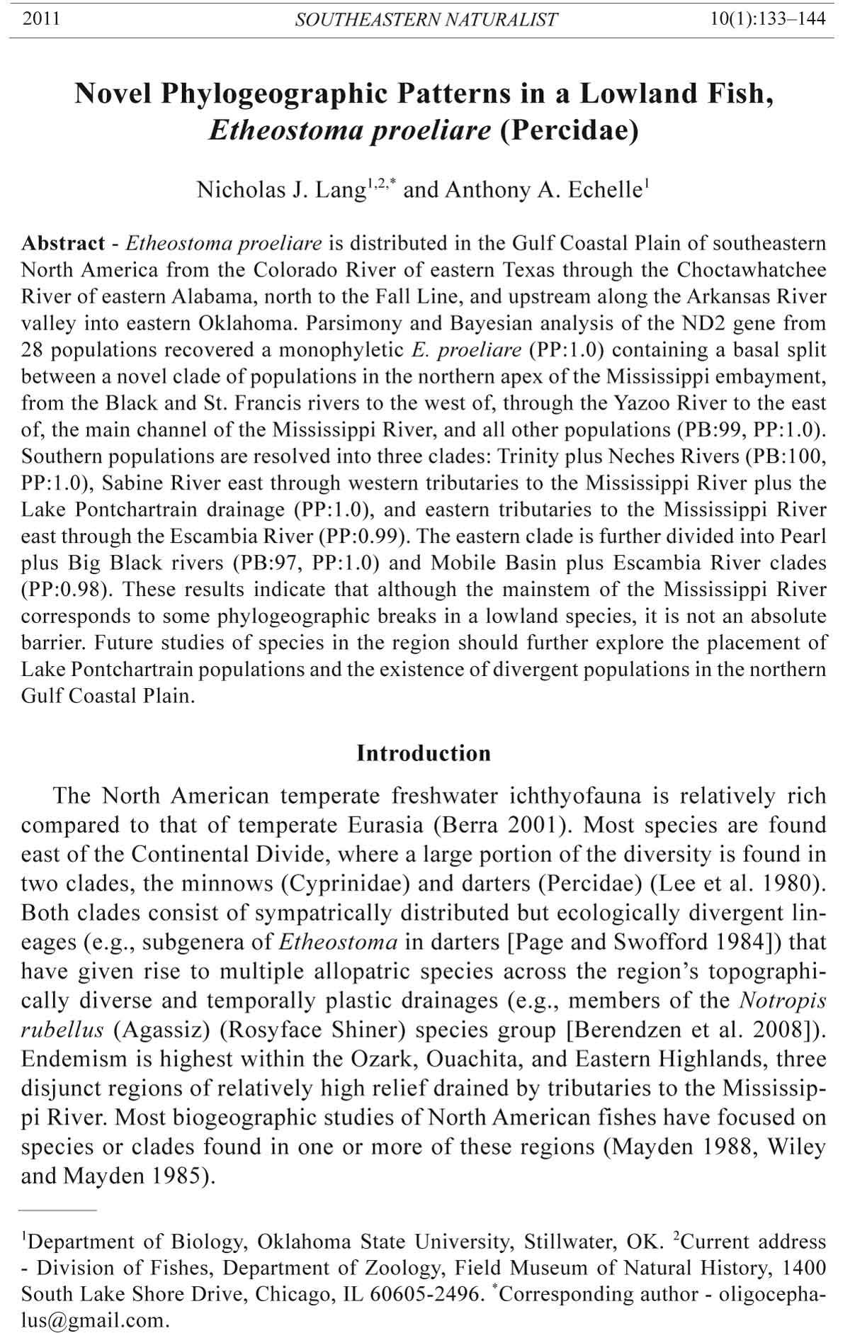 a phylogeographic study of the Cypress Darter and discuss our results in the