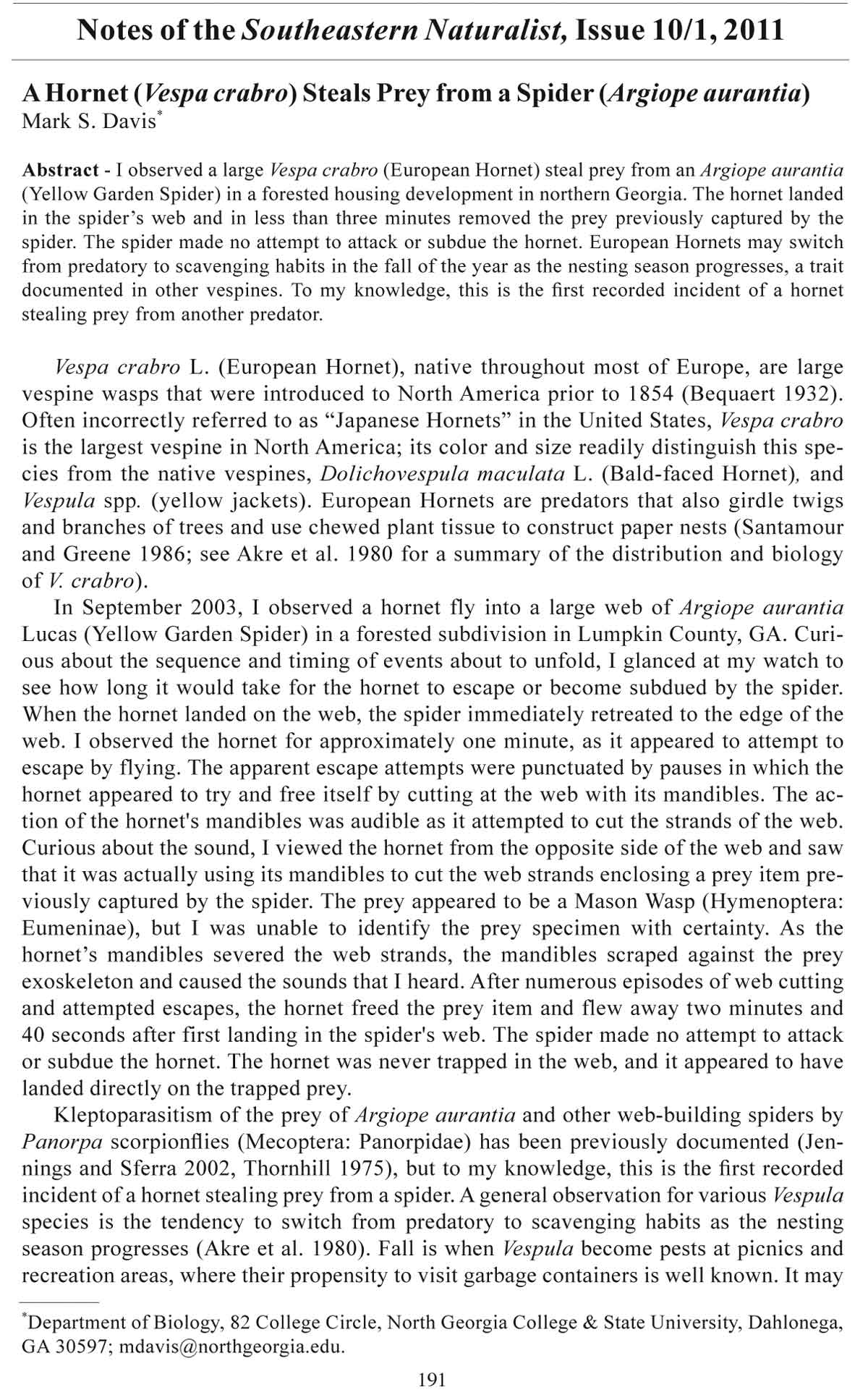 *Department of Biology, 82 College Circle, North Georgia College & State University, Dahlonega,