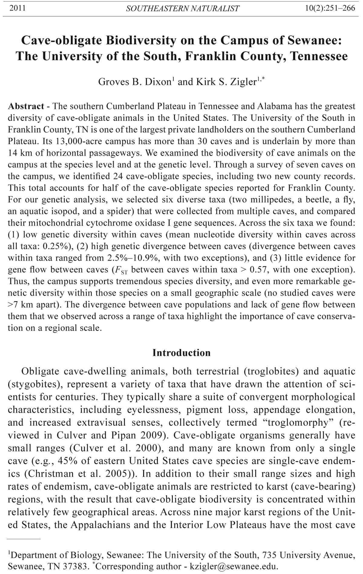 cave biodiversity (Culver et al. 2006). The campus of The University of the South