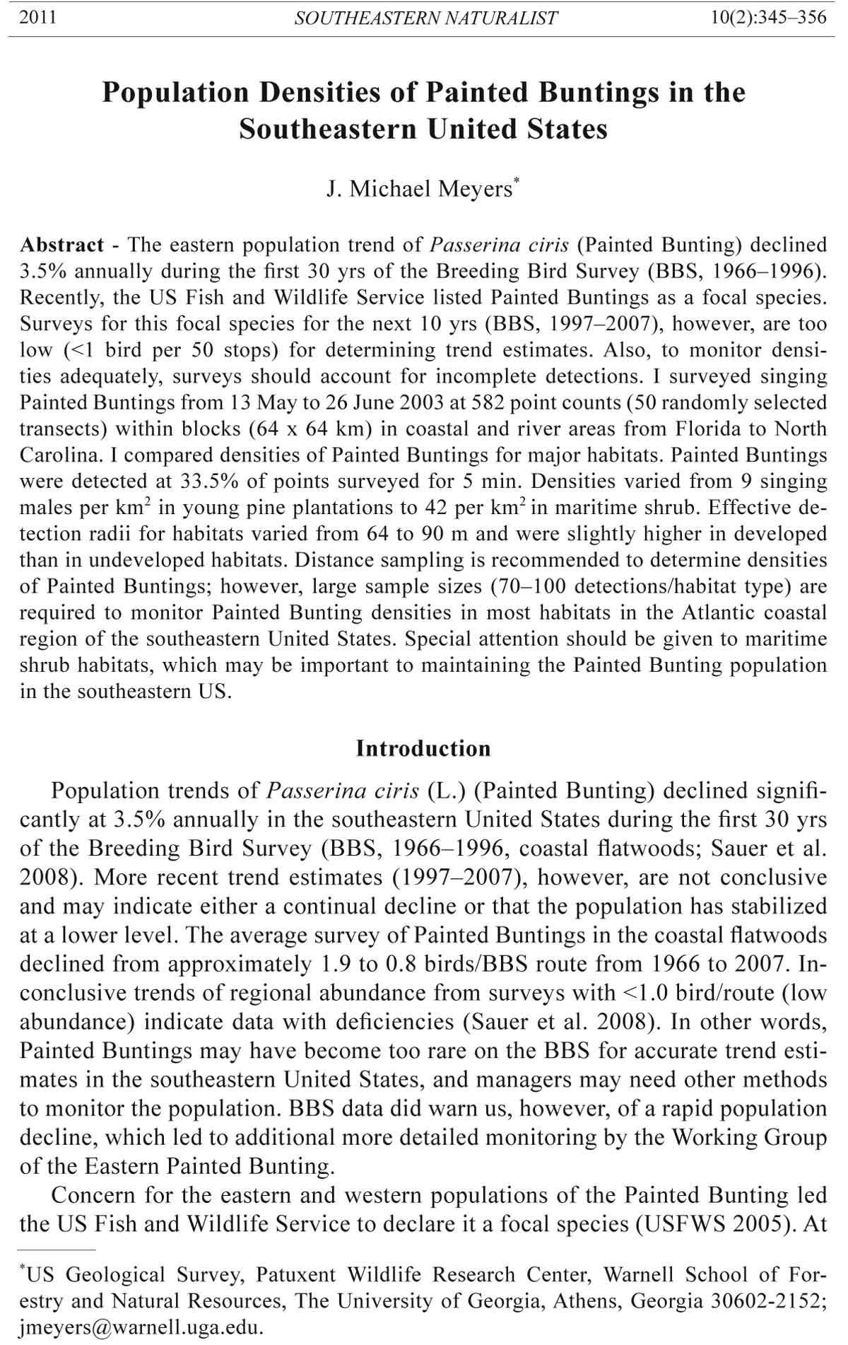Meyers 2005). In a two-year study of radio-tracked male Painted Buntings (n =
