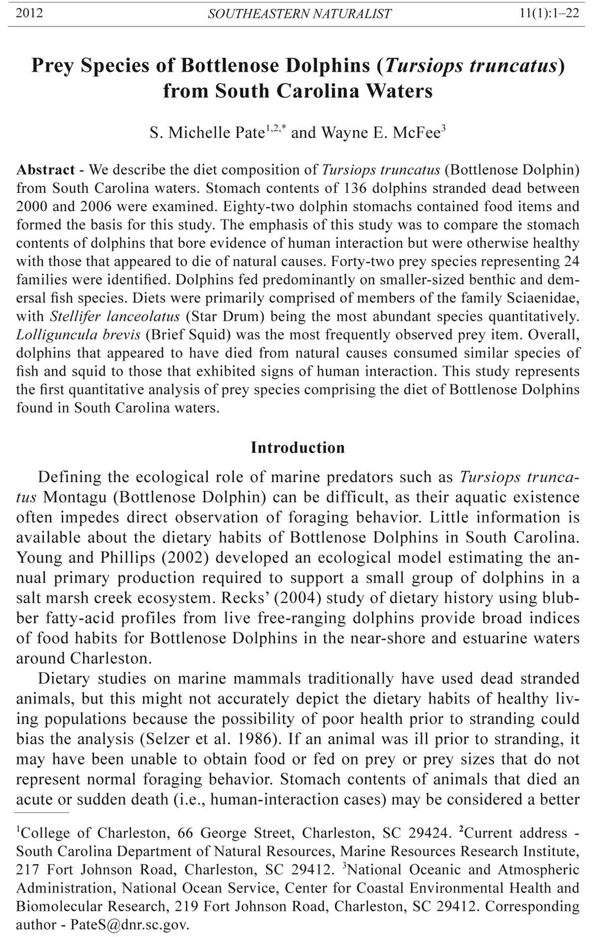 217 Fort Johnson Road, Charleston, SC 29412. 3National Oceanic and Atmospheric
