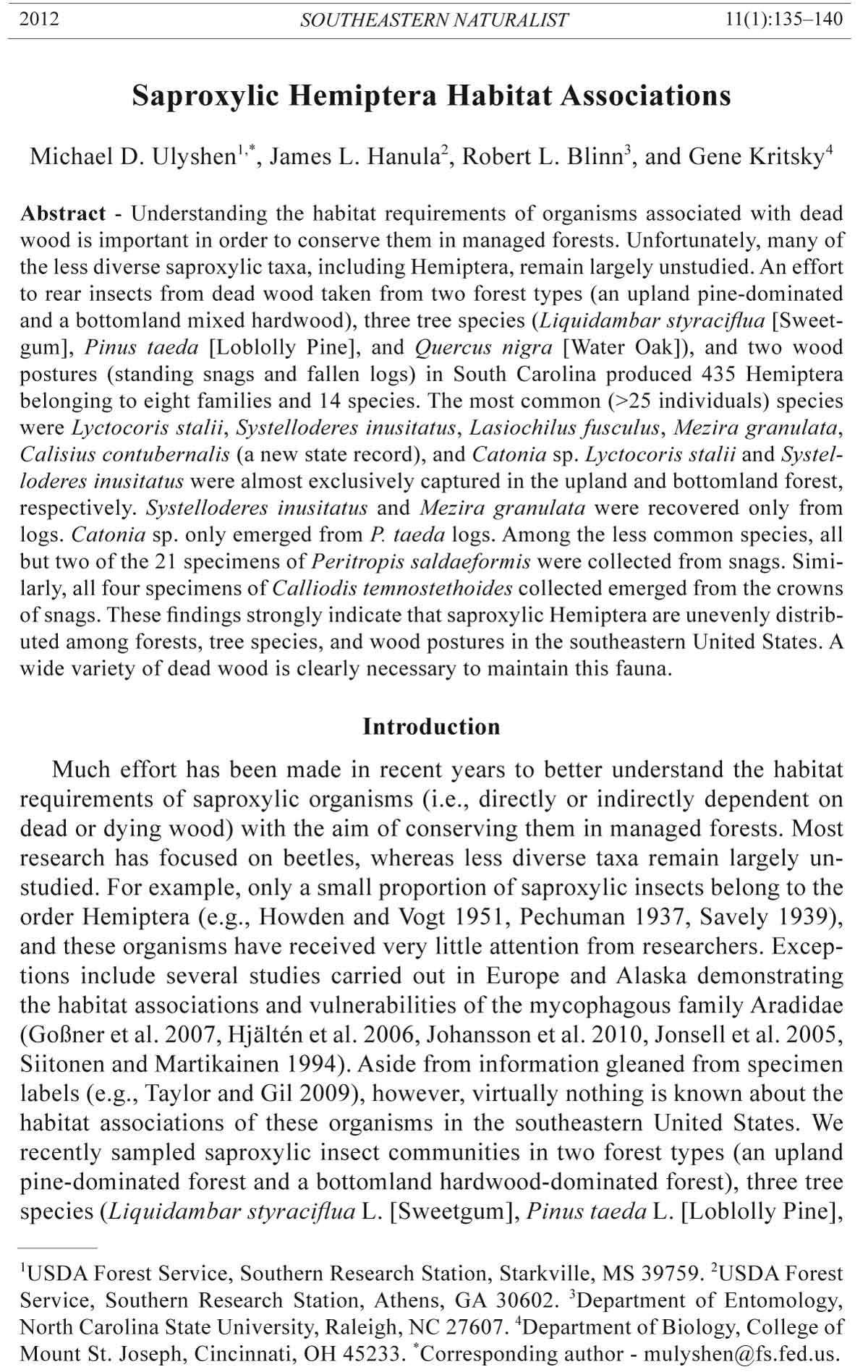 Michael D. Ulyshen1,*, James L. Hanula2, Robert L. Blinn3, and Gene Kritsky4