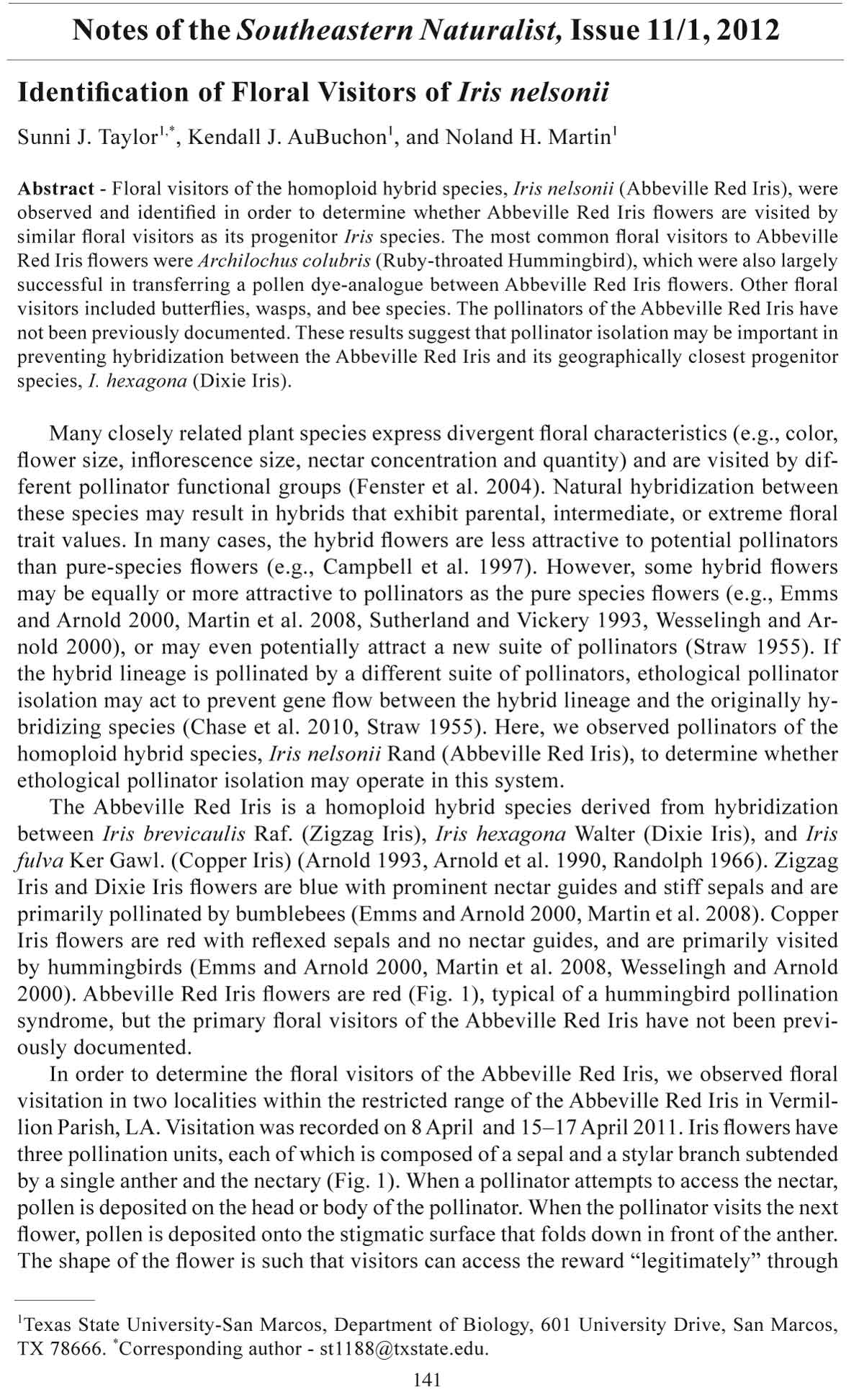 2000). Abbeville Red Iris flowers are red (Fig. 1), typical of a hummingbird pollination