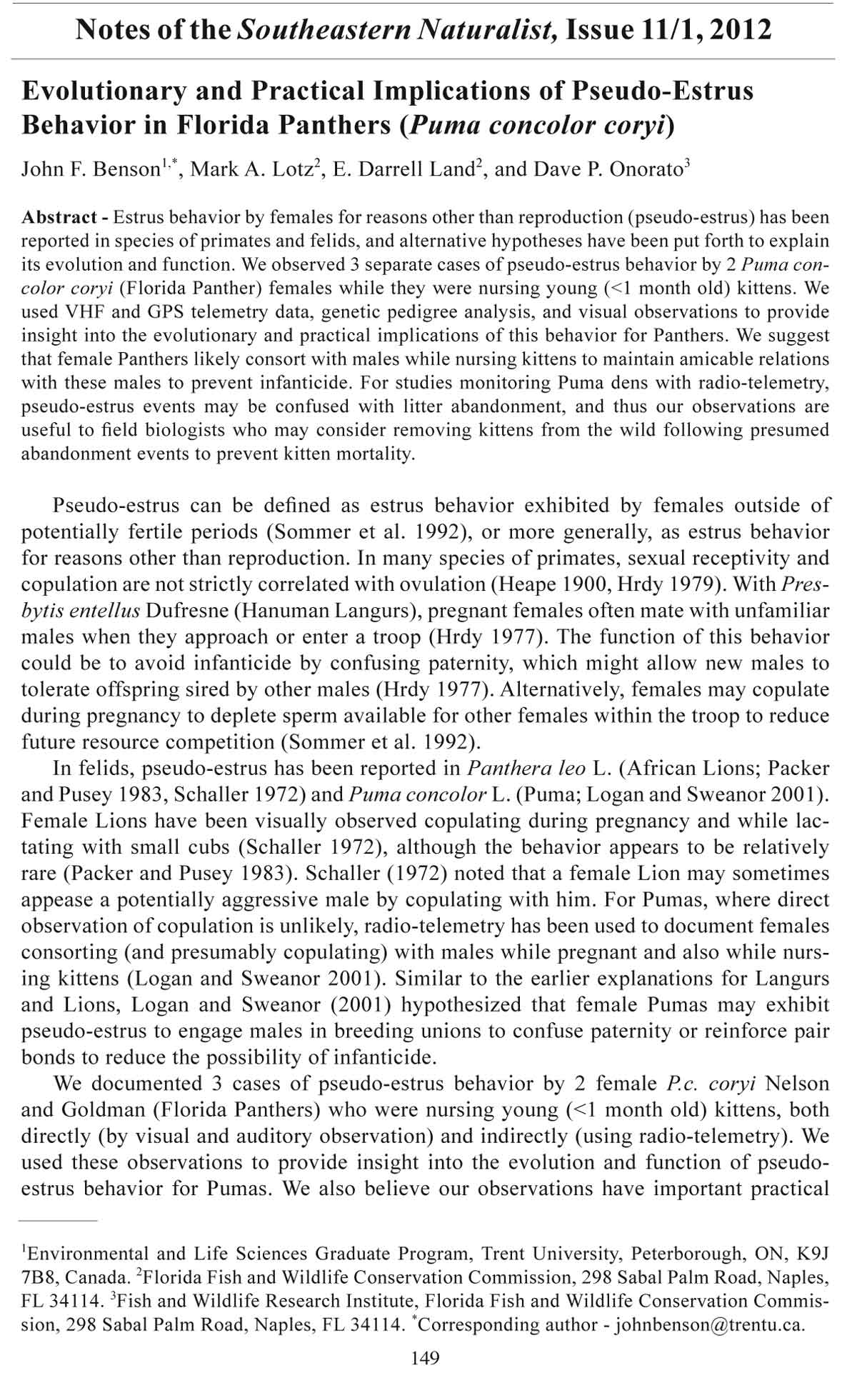 298 Sabal Palm Road, Naples, fl34114. *Corresponding author - johnbenson@trentu.ca.