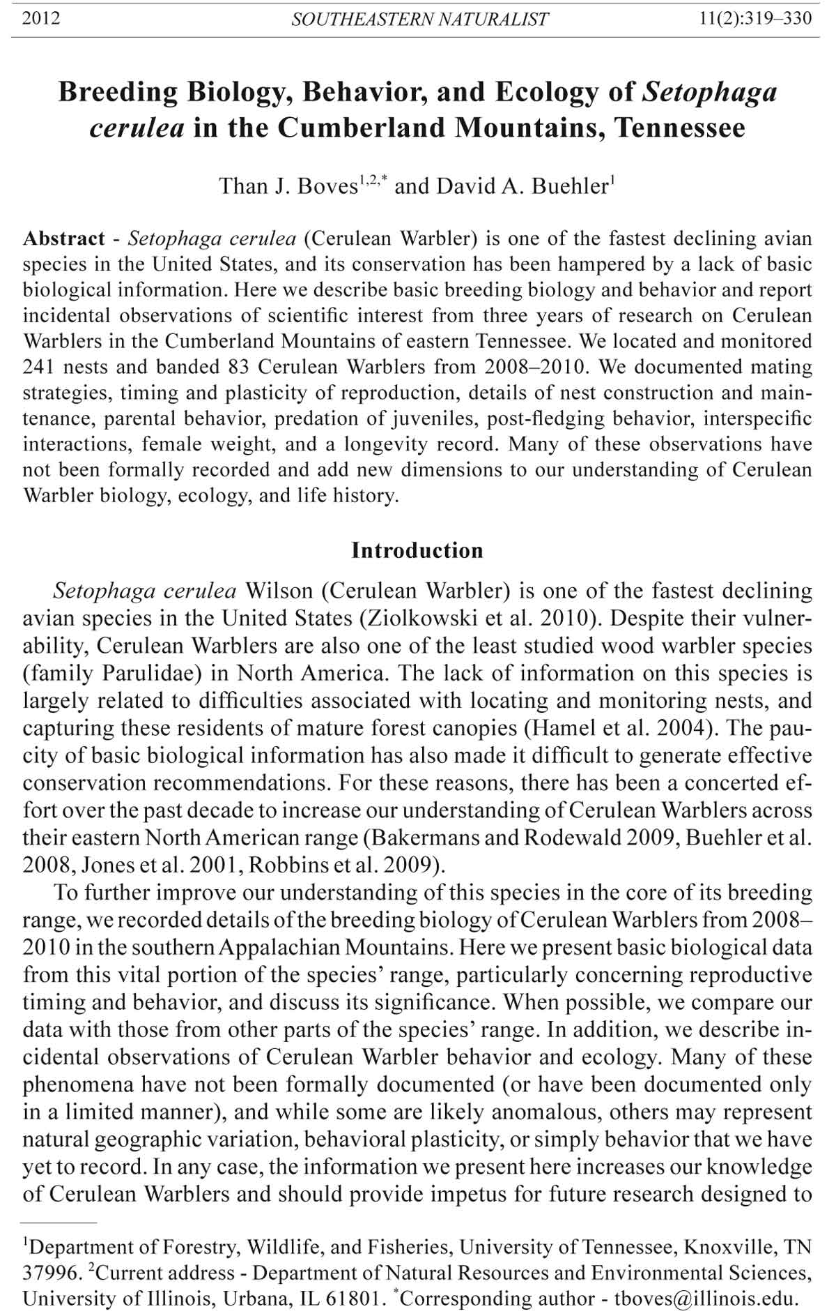 Boves, T.J. 2011. Multiple responses by Cerulean Warblers to experimental forest disturbance