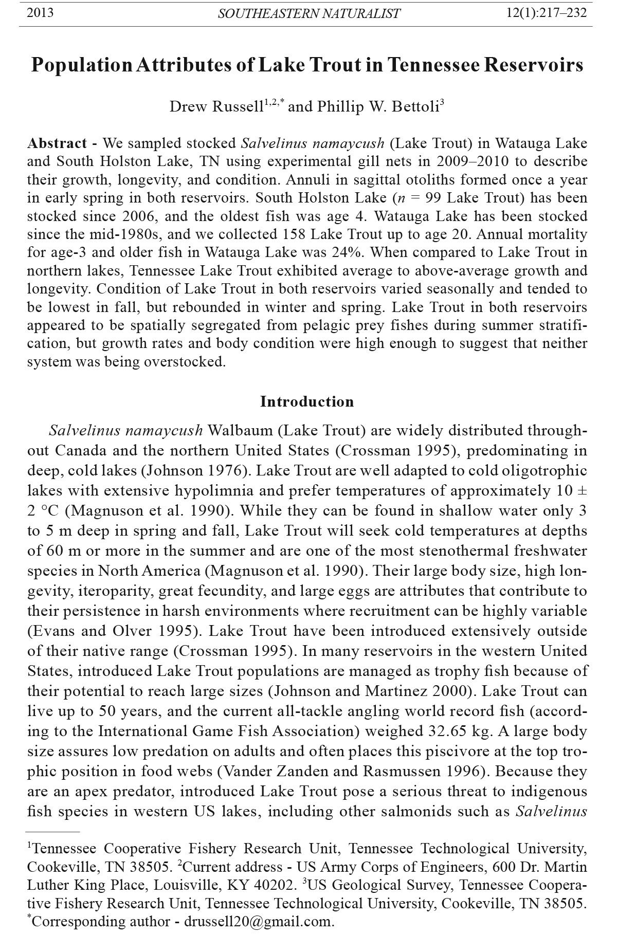 Population Attributes of Lake Trout in Tennessee Reservoirs