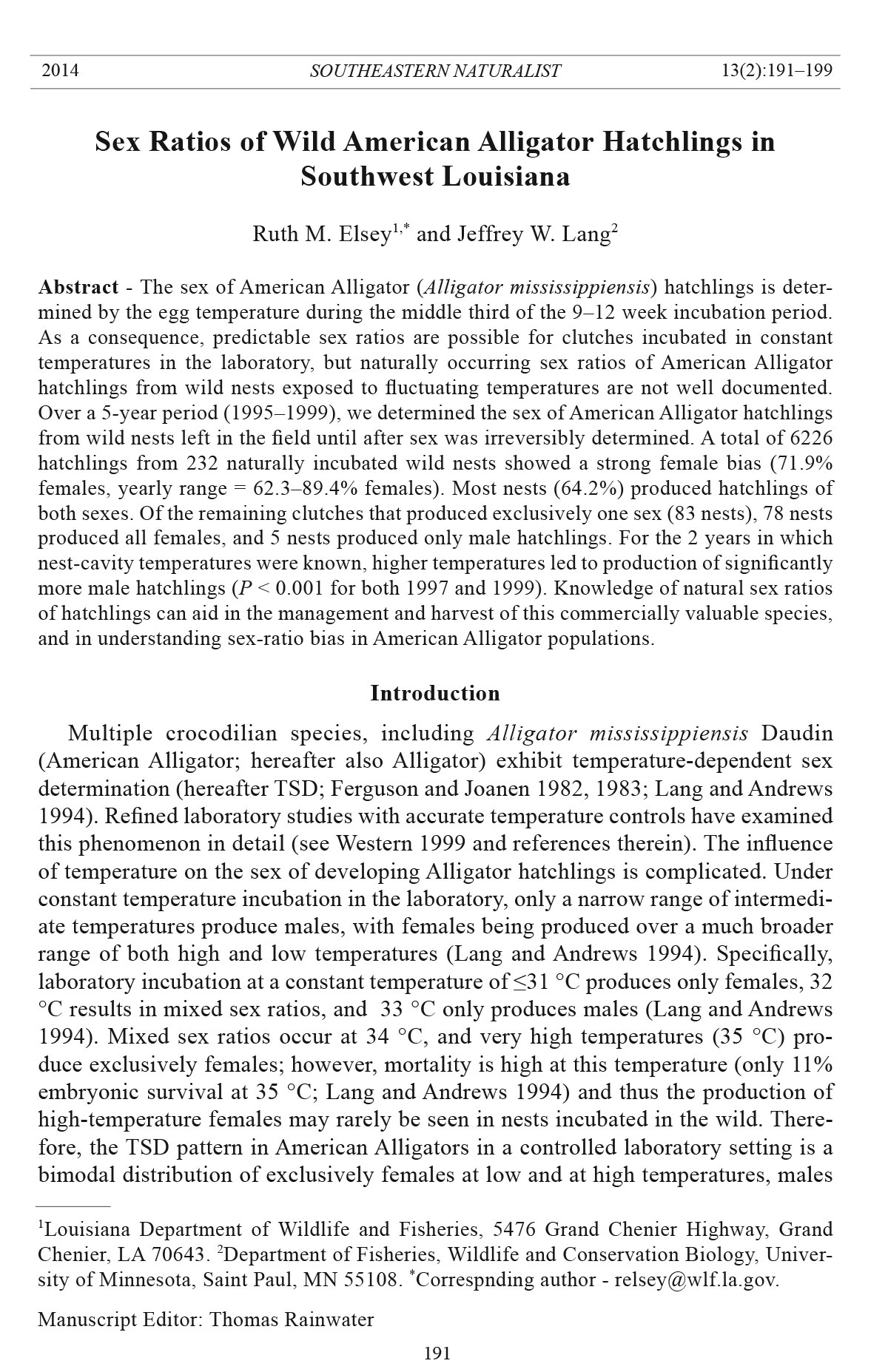 Ruth M. Elsey1,* and Jeffrey W. Lang2