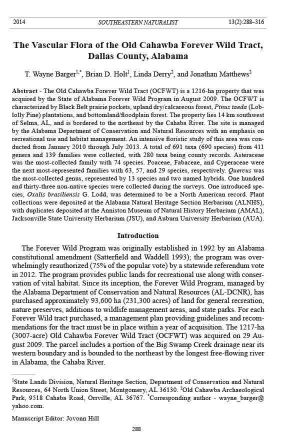 Abstract - The Old Cahawba Forever Wild Tract (OCFWT) is a 1216-ha property that was