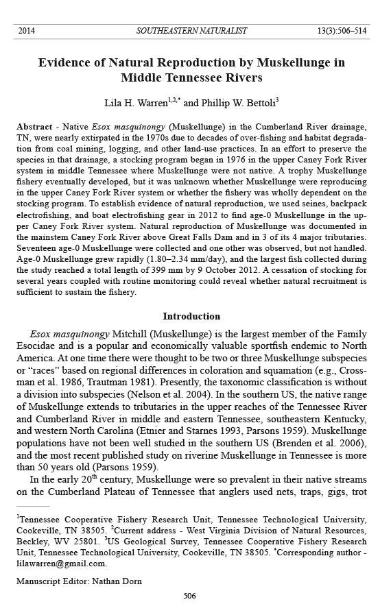 and the most recent published study on riverine Muskellunge in Tennessee is more