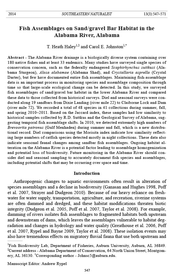 fish assemblages of sand/gravel bar habitat in the lower Alabama River and compared