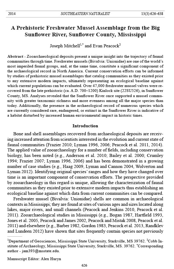 Peacock, E., and T.R. James. 2002. A prehistoric unionid assemblage from the Big Black