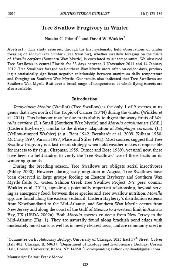 2012. Tree Swallows foraged on Southern Wax Myrtle more often on colder days, producing