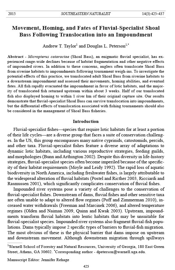 Taylor, A.T., and D.L. Peterson. 2014. Shoal Bass life history and threats: A synthesis of