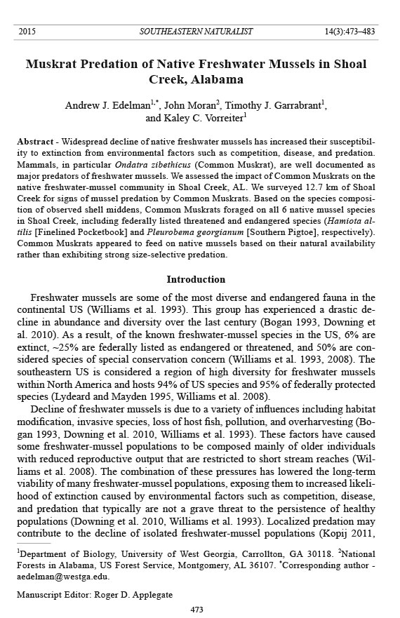 predation of freshwater mussels by Muskrats in Shoal Creek has been anecdotally