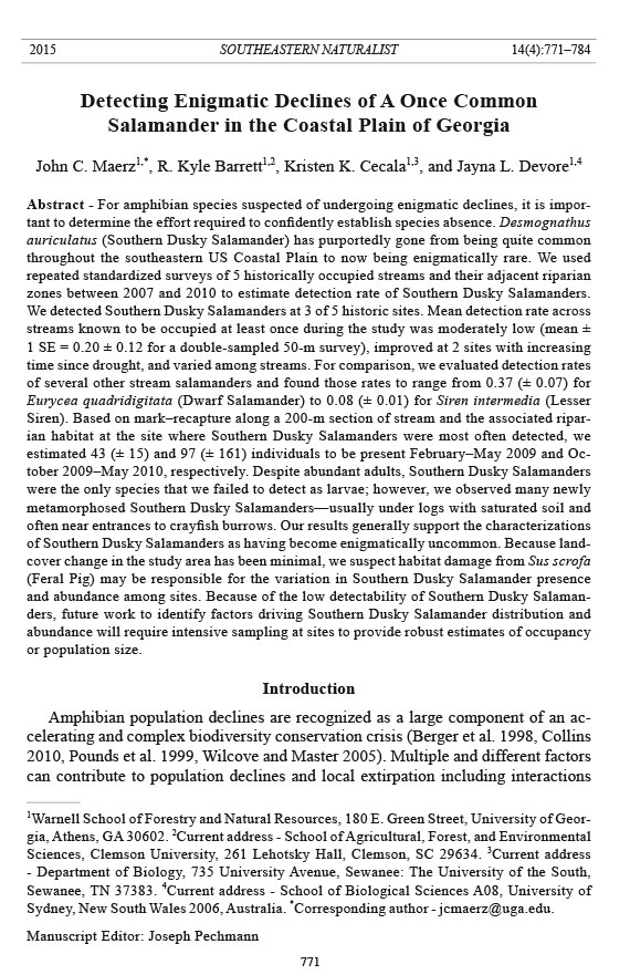 Maerz. J.C. 2010. Status and decline of Desmognathus auriculatus in Georgia: Causes and