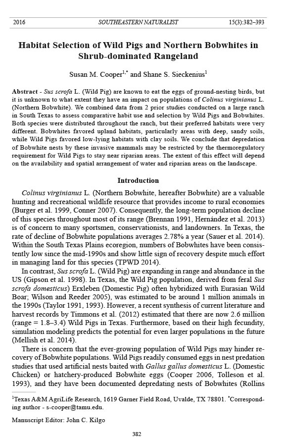 in South Texas to assess comparative habit use and selection by Wild Pigs and Bobwhites.
