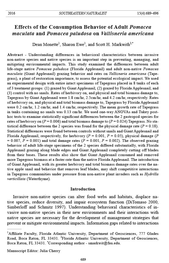 more Tapegrass biomass at a faster rate than the native Florida Applesnail. The introduction
