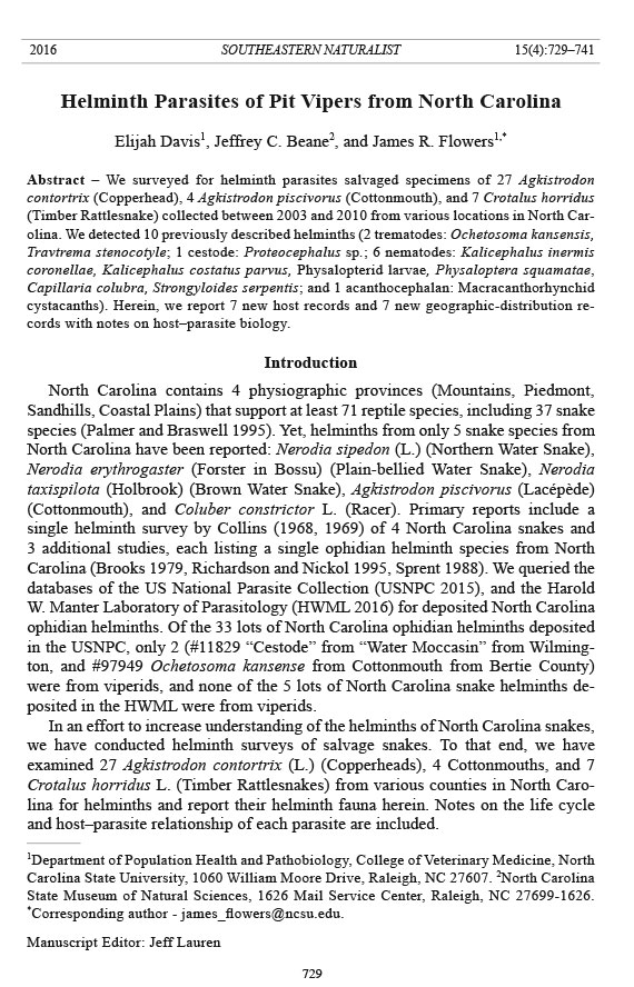 In an effort to increase understanding of the helminths of North Carolina snakes,
