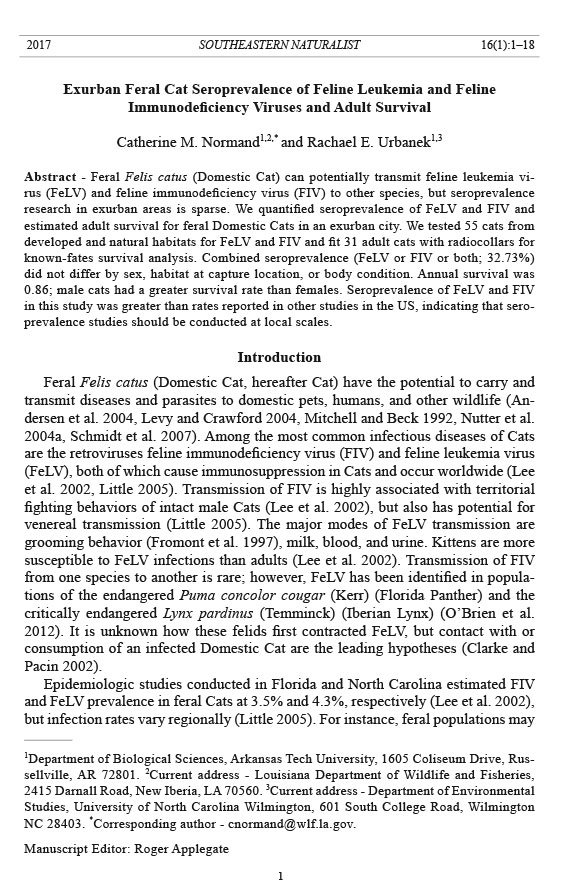 Abstract - Feral Felis catus (Domestic Cat) can potentially transmit feline leukemia virus