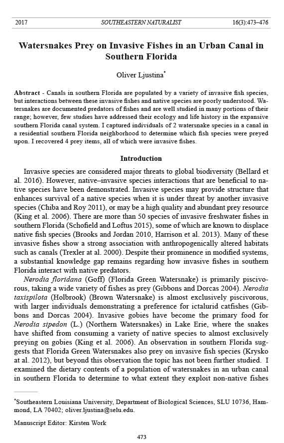 that Florida Green Watersnakes also prey on invasive fish species (Krysko