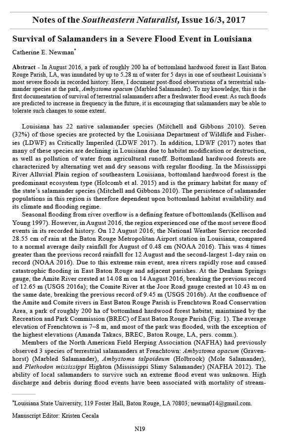 Survival of Salamanders in a Severe Flood Event in Louisiana