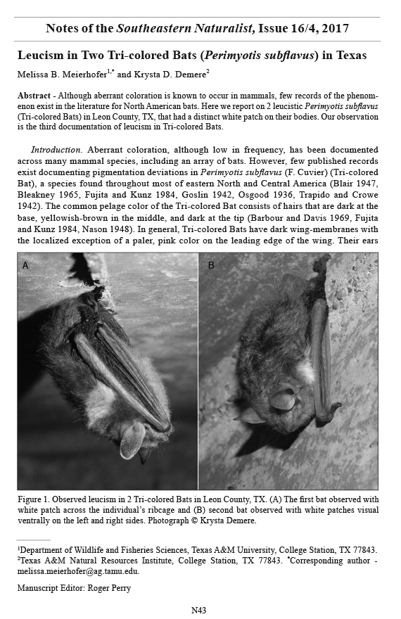 of Tri-colored Bats in Leon County, TX, we discovered 2 bats with leucism. We observed
