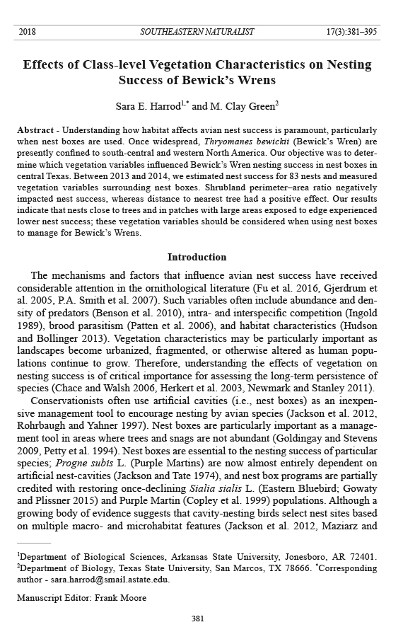 characteristics on the nesting success of Bewick’s Wrens in central Texas.