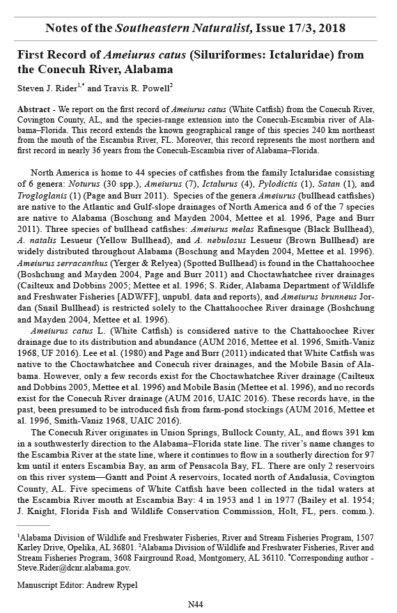 of White Catfish in Alabama. We deposited this specimen in the Alabama Division of