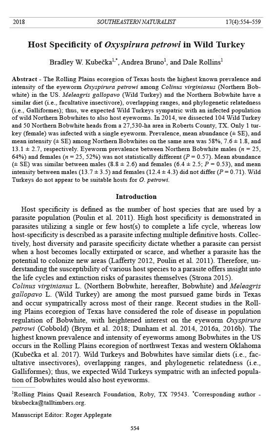 Dunham, N.R., S. Reed, D. Rollins, and R.J. Kendall. 2016b. Oxyspirura petrowi infection