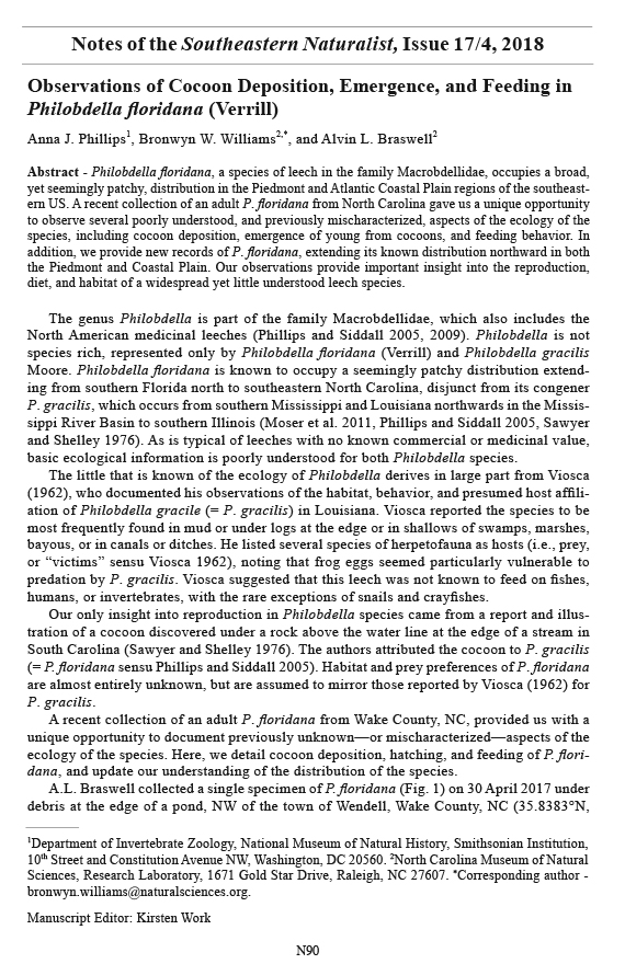Smith, D.G. 1977. The rediscovery of Macrobdella sestertia Whitman (Hirudinea: Hirudinidae).