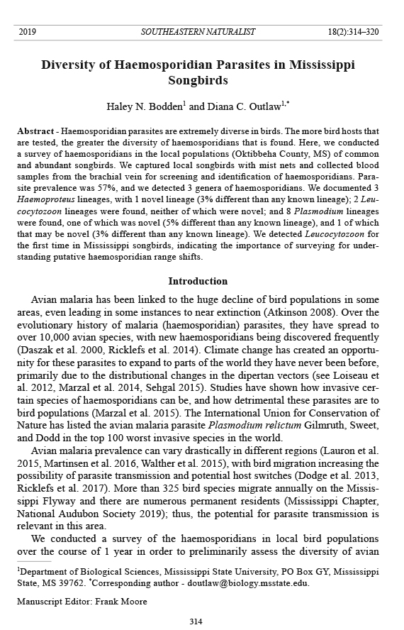 Larson, D.A., J. Goddard, and D.C. Outlaw. 2017. Mosquito vectors of avian malaria in