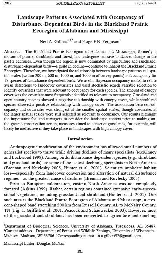disturbance-dependent birds—a guild in decline—continue to inhabit the Blackland Prairie