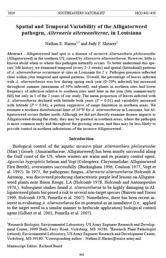 Harms, N.E., and J.F. Shearer. 2017. Early-season dynamics of Alligatorweed biological