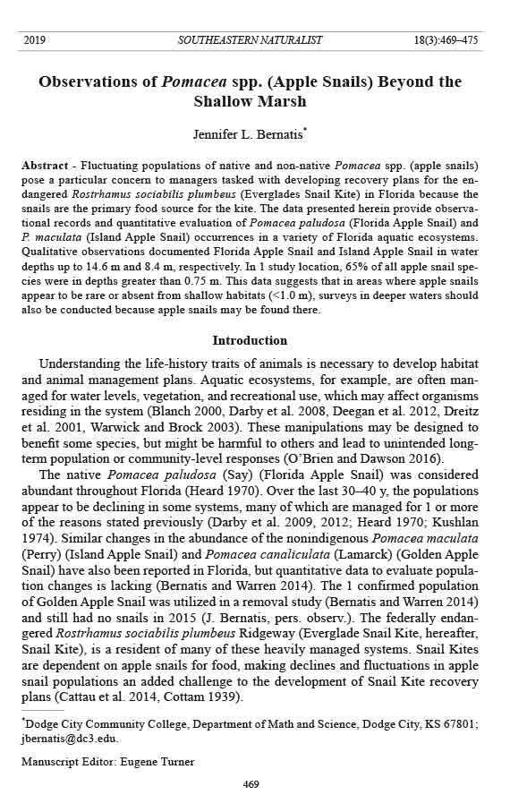 Bernatis, J.L. 2010. New depths for the Florida Apple Snail, Pomacea paludosa. Ellipsaria