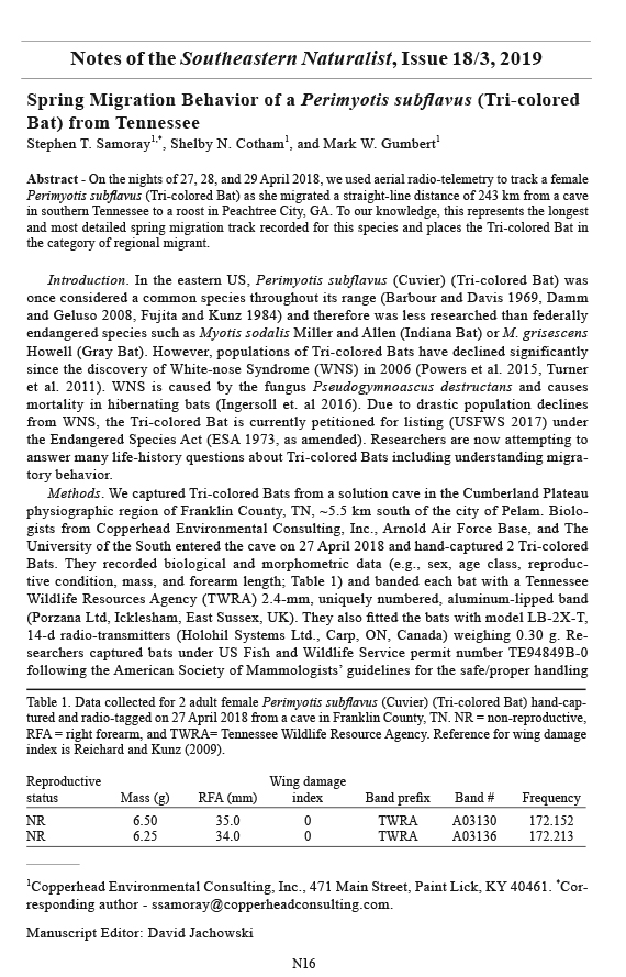 to actively track a migrating Tri-colored Bat took place in Wisconsin in 2017 using groundbased