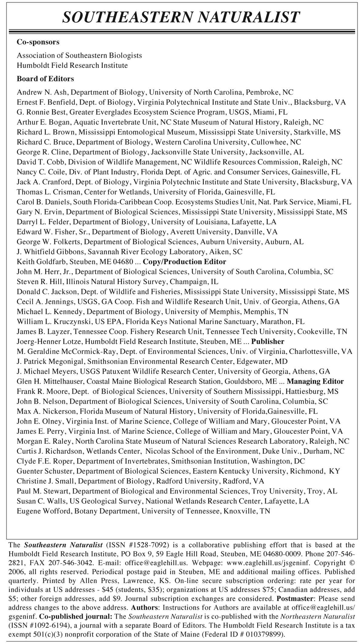 Southeastern Naturalist, Volume 5, Issue 1 (2006)