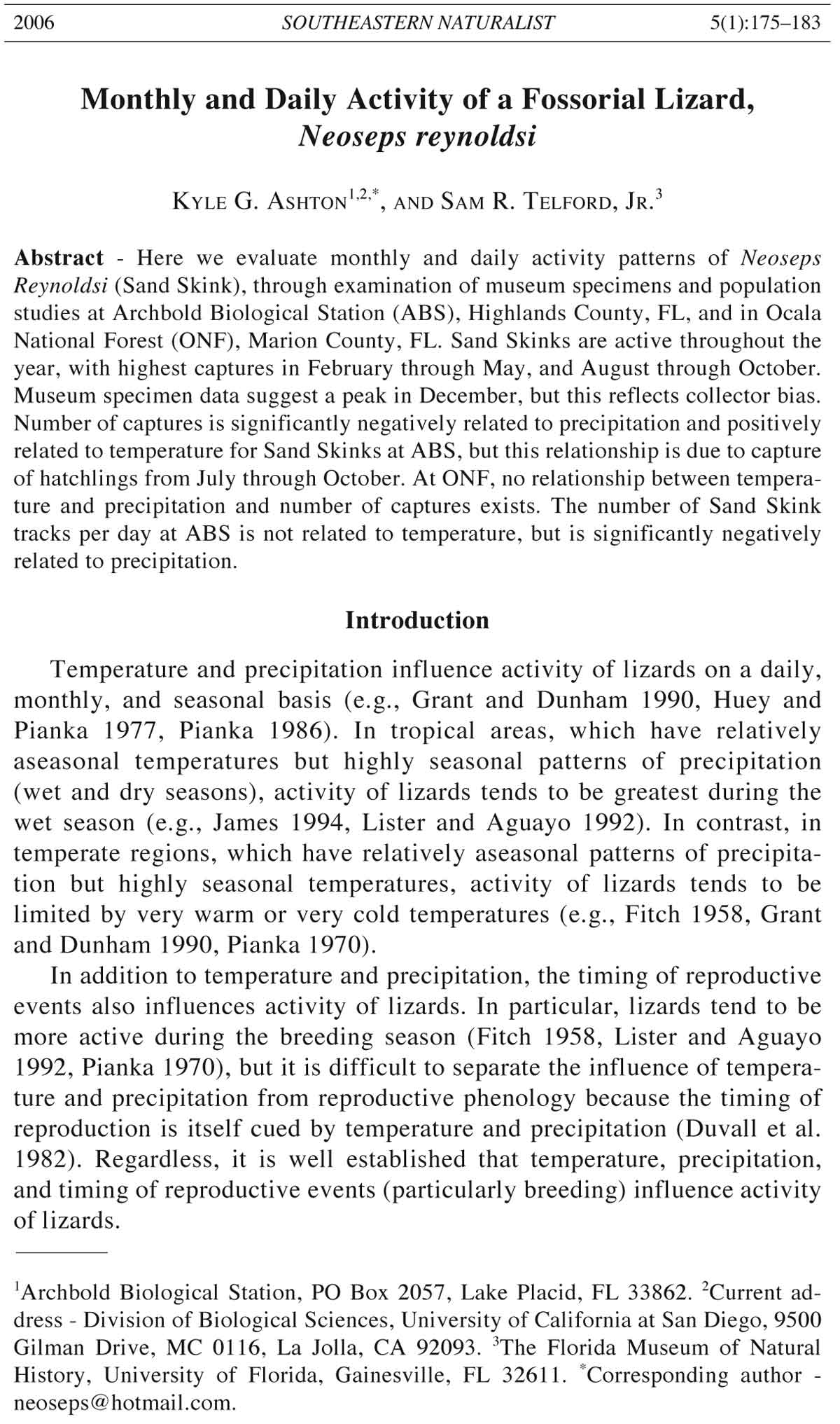 1Archbold Biological Station, PO Box 2057, Lake Placid, FL 33862. 2Current address