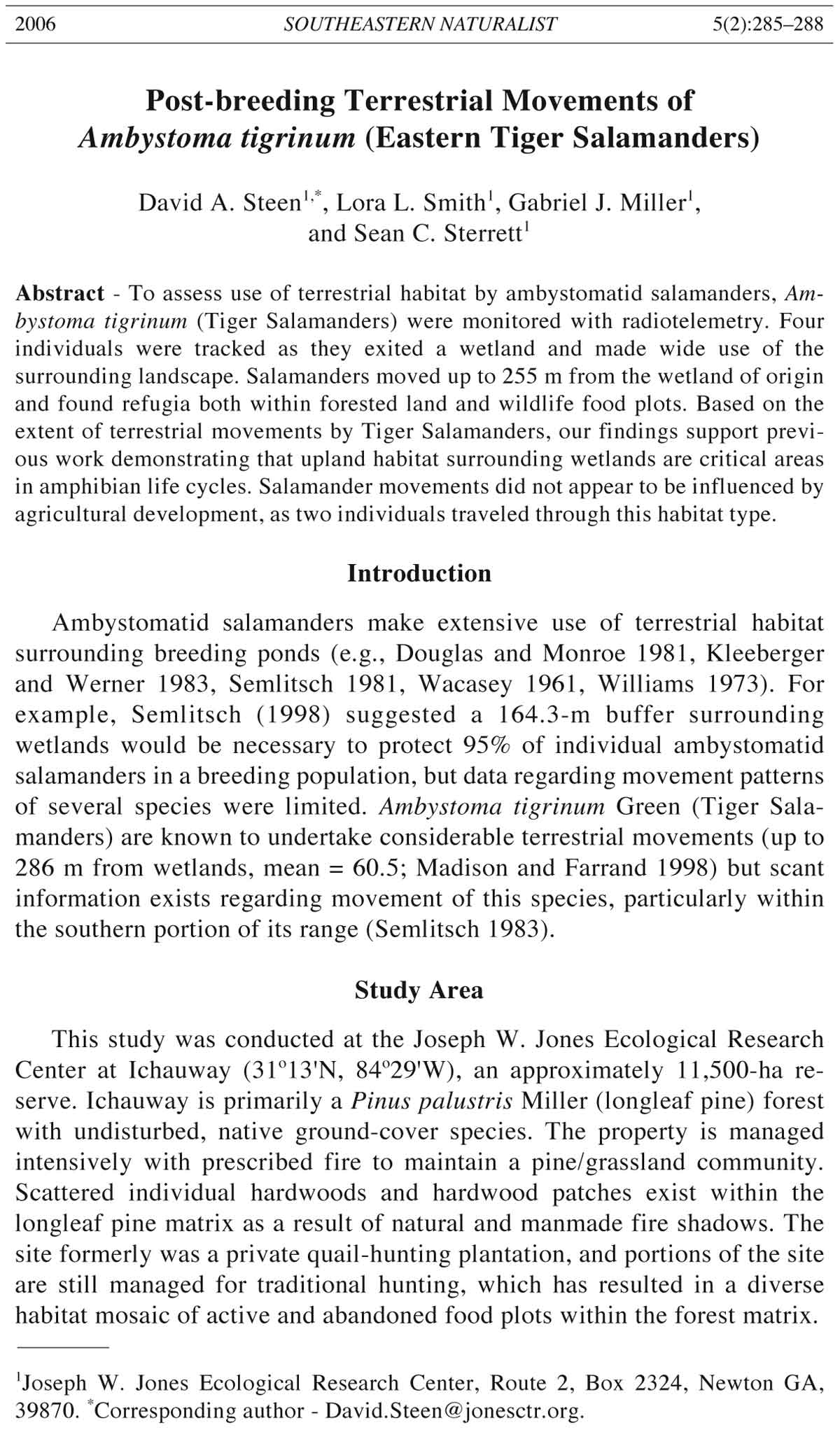 Semlitsch, R.D. 1983. Terrestrial movements of an Eastern Tiger salamander, Ambystoma