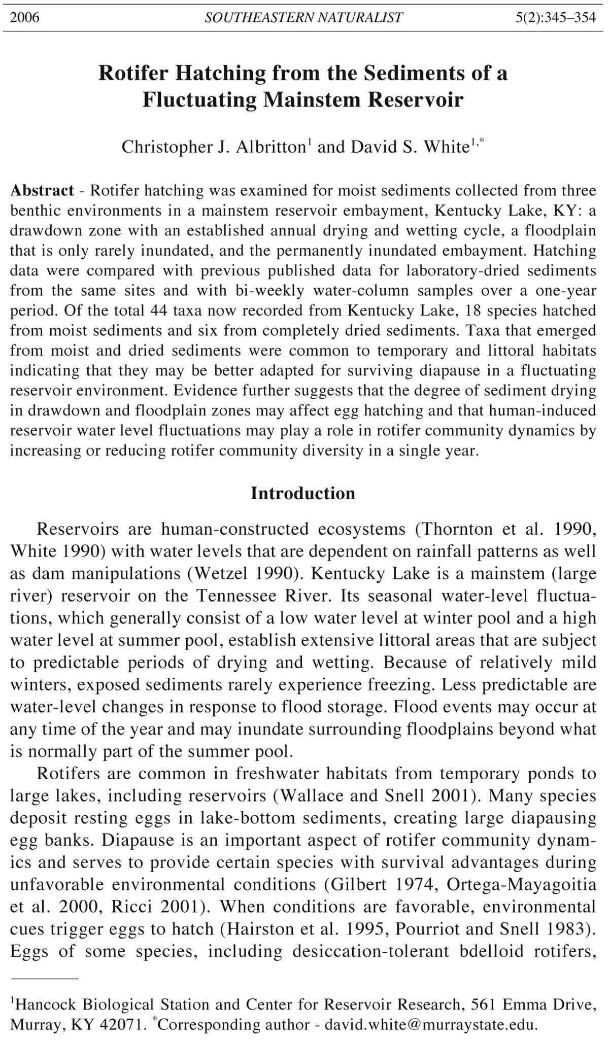 Albritton, C.J., and D.S. White. 2004. Hatching of rotifer eggs from reservoir