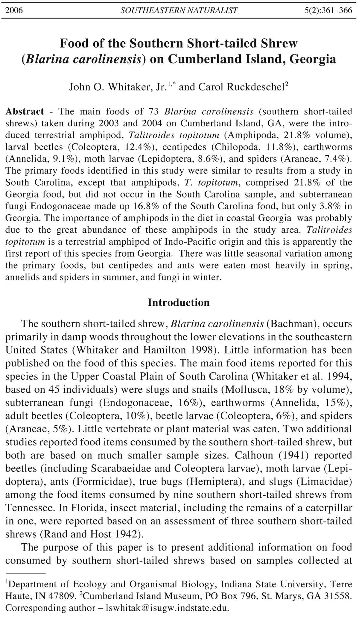 (Whitaker and Mumford 1972), the occurrence in the diet of southern shorttailed