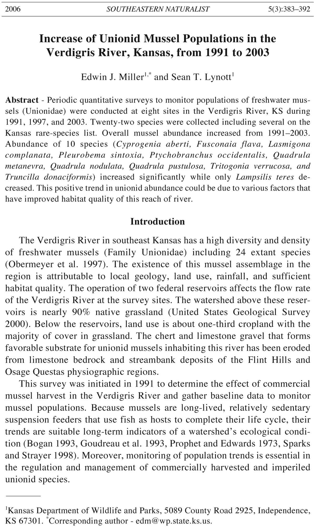 Kansas rare-species list. Overall mussel abundance increased from 1991–2003.