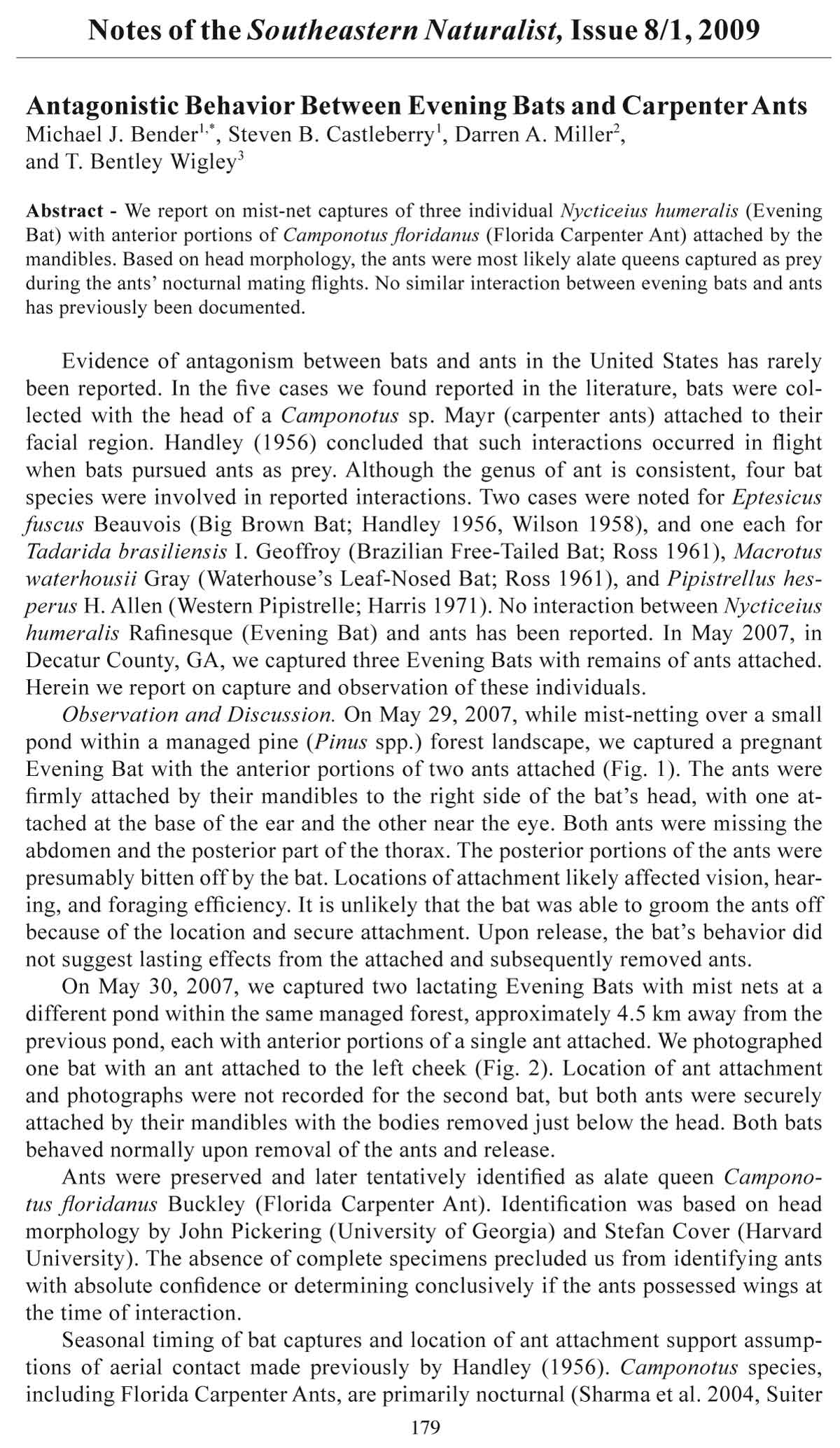 Bat) with anterior portions of Camponotus fl oridanus (Florida Carpenter Ant) attached by the