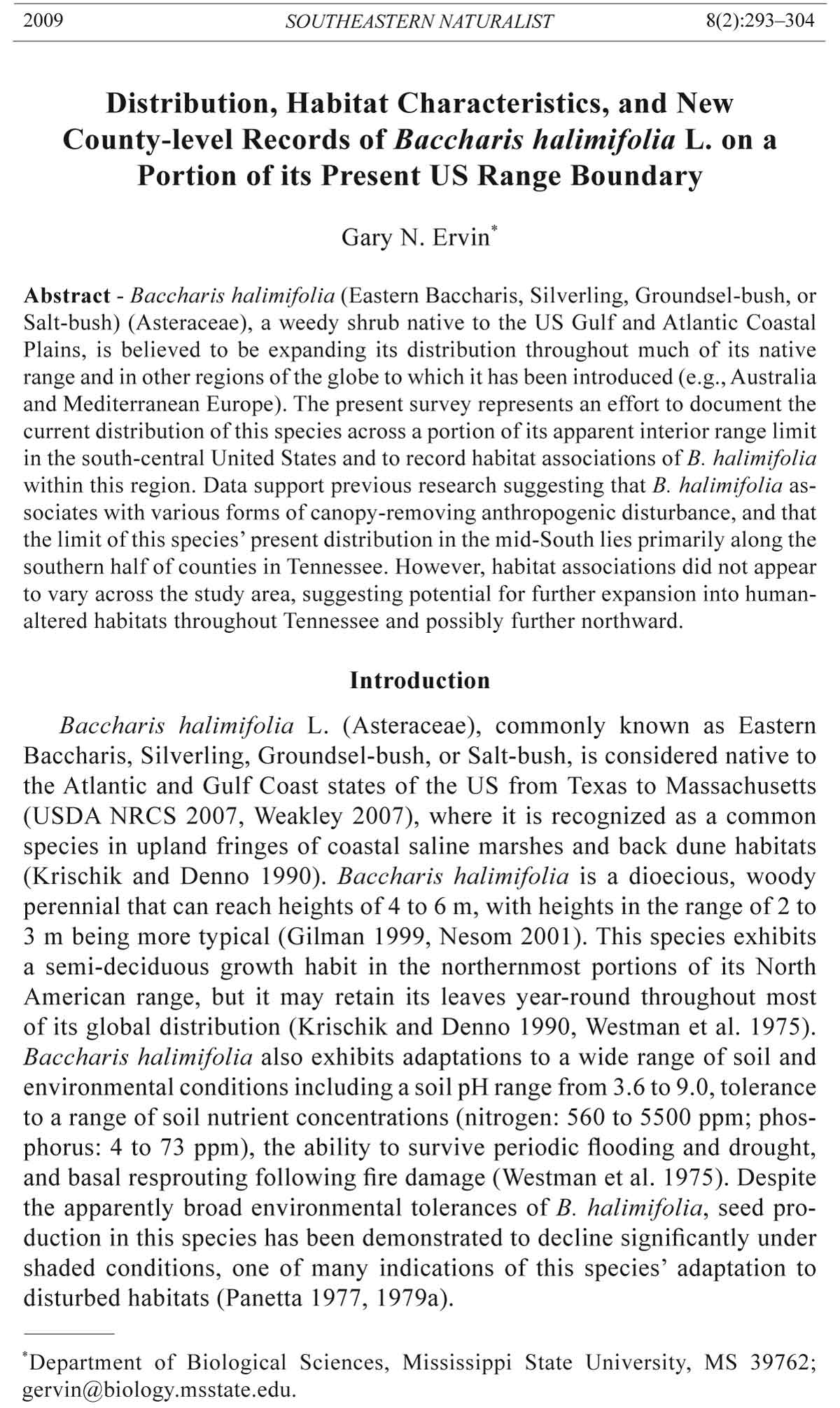 (USDA NRCS 2007). Baccharis halimifolia recently was reported from two