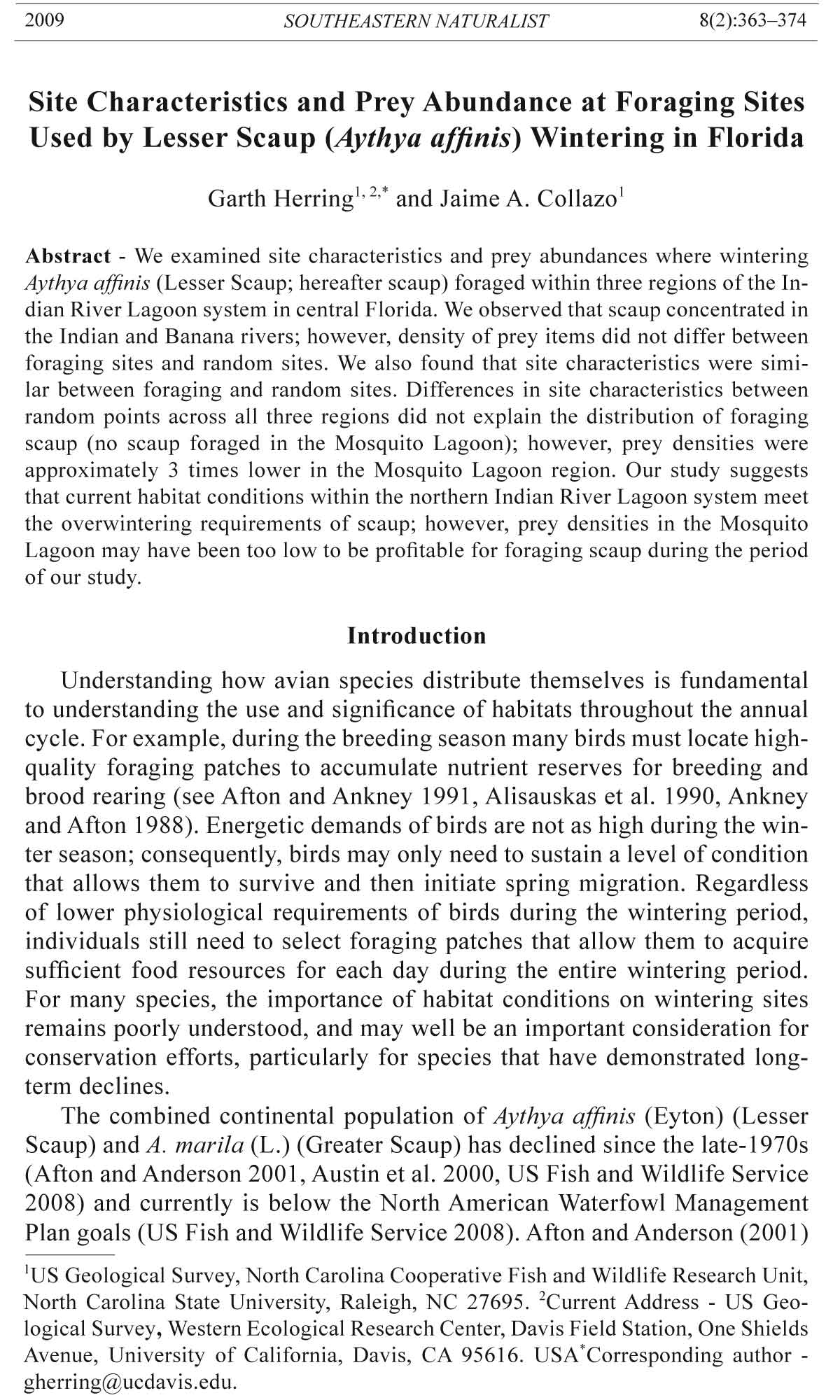 Herring, G., and J.A. Collazo. 2004. Winter survival of Lesser Scaup in east-central