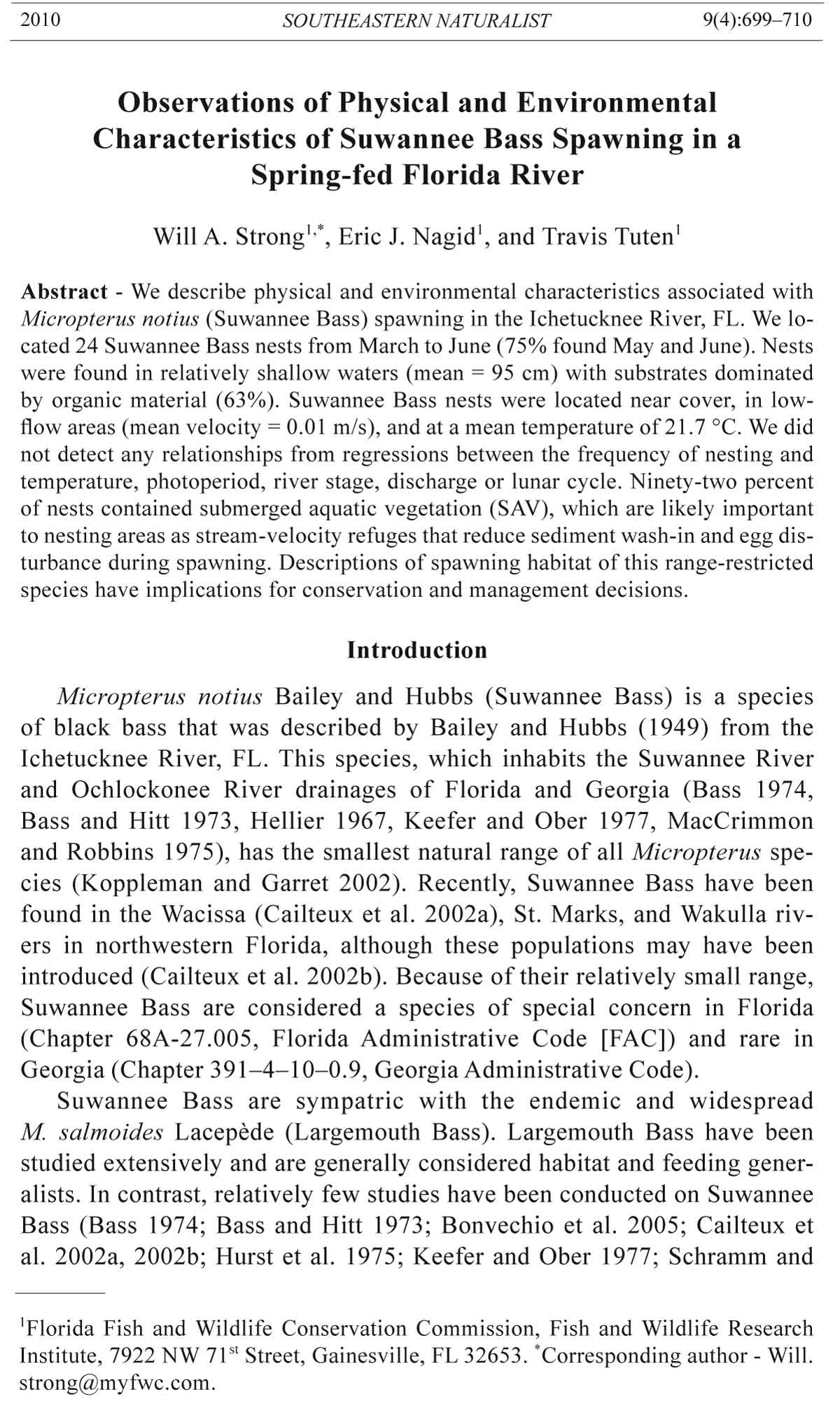 by organic material (63%). Suwannee Bass nests were located near cover, in lowflow areas (mean velocity = 0.01 m/s), and at a mean temperature of 21.7 °C. We did